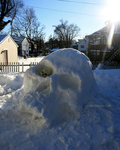My hometown was hit by this year's crazy blizzard and since we're not used to dealing with snow down South, everything shut down. After 2 days stuck at home we all start to get a bit stir crazy. Luckily the sun was out today and snow was finally packing friendly, so I decided to add another snow skull creation to my collection...